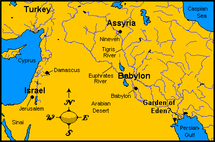 Turn in your Bibles to Genesis 2:10-14. We see in verse 10 that "a river went out of Eden to water the garden; and from thence it was parted, and became into four heads." Then four rivers are named: Pison, Gihon, Hiddekel, and the Euphrates. No one knows where the Pison was and neither do they know where the Gihon was. However, the Hiddekel River is sometimes called the Tigris River, even to this day. The Euphrates River is identified in the passage. Therefore, the greater part of Bible scholars believe that Eden was somewhere in the area between the Tigris and Euphrates rivers.